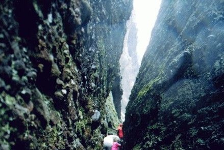 一閘險一閘,閘閘景不同。水井入谷口處,為“一道閘”。南北山崖壁立,谷底難容一足,眼前是一層樓高的“天梯”通道。出了“一道閘”,抬頭仰望南面半山崖有一處月牙形的龐然大洞;拾級而上,一個能容千人的石洞,常年干爽明亮、冬暖夏涼,這里被人們稱為“石窟王宮”。進入“二道閘”,它比起“一道閘”更加窄長、更加險峻。剛才是陽光明媚,轉眼間便是天昏地暗。抬頭便可望見兩崖撐天,便是著名的“一線天”景觀。天設地造,極其美妙。在閘內可以看見南面懸崖上飛濺出一道高約50米、寬5米的“水簾”,似乎向攀巖者彈奏出歡快的迎賓曲?!叭篱l”上下約有三層樓高,人們無處落腳,比黃山的“鯽魚背”更險一籌。身后是萬丈深淵,腳下峭壁陰森,穿過小水潭,隱約能看到懸崖峭壁之間有一條縫隙,其名“地縫”,循著人工開鑿的石凹,手腳并用往上攀爬,進入谷內,有一種豁然開朗的感覺,攀上谷口時,不妨回頭細看兩石壁上閘痕清晰可辨,谷內就是古時的避王巖。