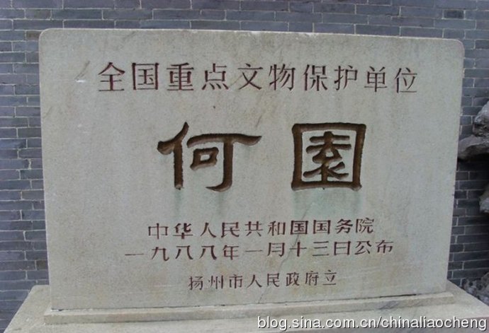 揚州市人民政府為何園立的全國重點文物保護單位石碑。
