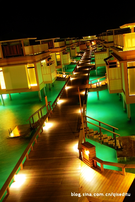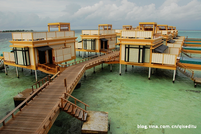 這就是維拉瓦魯的水上屋了,通過一條木板走廊鏈接在一起,遠處綠色的那一片,就是主島,俗稱海龜島