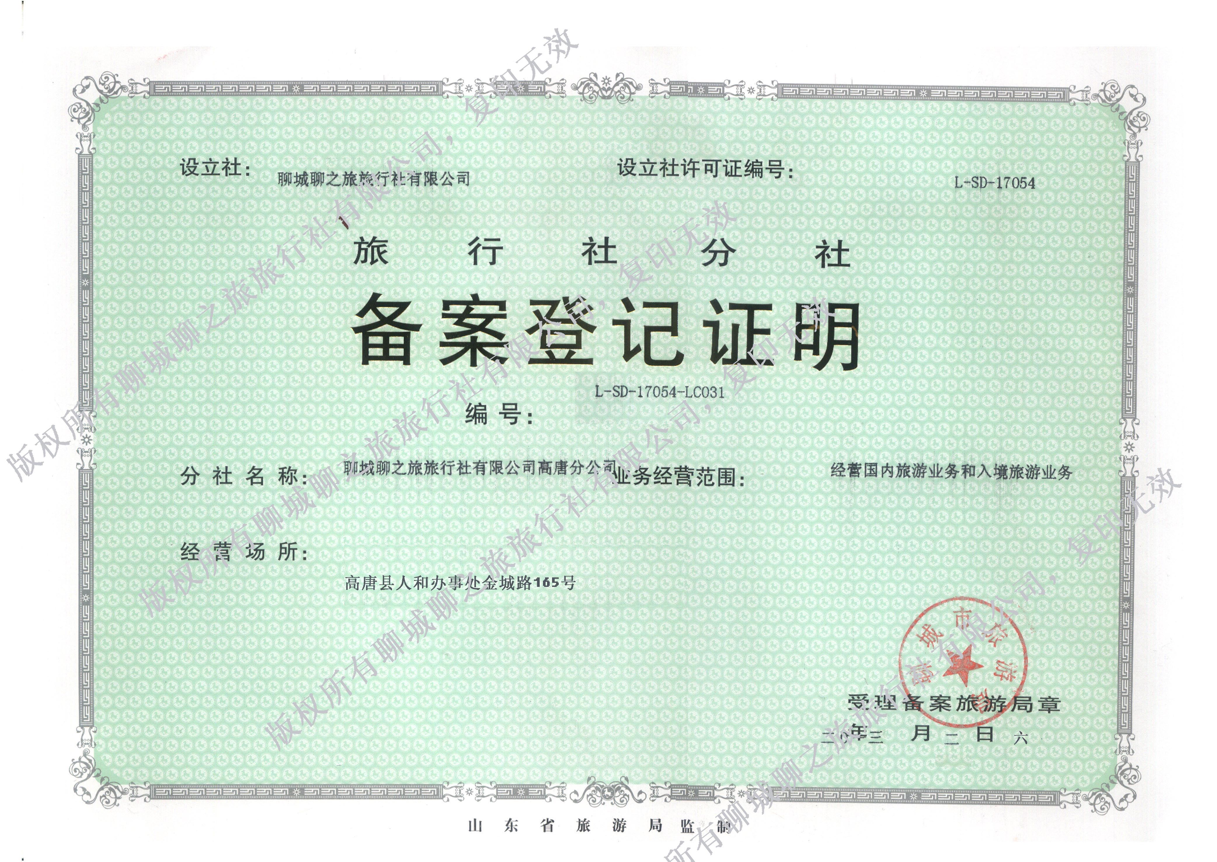 熱烈祝賀聊城聊之旅旅行社有限公司高唐分公司手續完畢