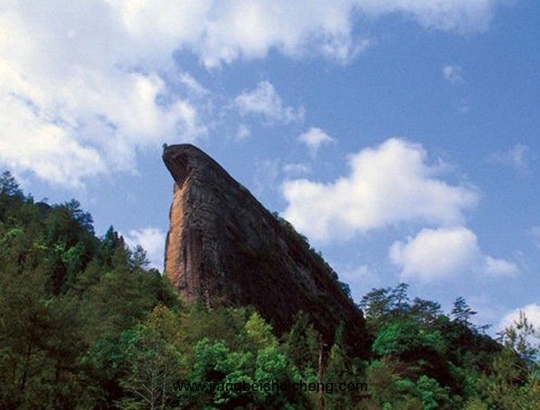 從天車架往西行約數百米,便可看見一座形似雄鷹的巨巖。“雄鷹獨立健無倫,銳喙昂頭實逼真。豈是神山厭凡鳥,欲君奮擊絕器塵”。形象、生動地描繪出了鷹嘴巖的雄姿。鷹嘴巖在章堂澗南側,如一頭向東昂首的雄鷹,嘴中含(生)著一株刺柏,形象奇妙,是武夷九十九巖中最好的一景。鷹嘴巖北有丹霞嶂,處在章堂澗邊,壁上有洞,相傳太平天國時,崇安城內一富豪懼怕農民起義軍對他清算,攜眷逃避來此,藏身洞中。后來他在洞中建造了樓閣,并裝上轆轤便于上下,人稱天車架。版權所有山東聊城聊之旅國際旅行社有限公司,轉載必究!今樓閣已荒廢,天車架也已不存,僅留遺跡供人觀看,成為一景。鷹嘴巖是一座渾然一體的巨巖,光禿禿的巖頂,東端向前突出,尖曲如喙。出奇的是,鉤形的“鷹嘴”上竟然生長首一株枝干虬屈的古老刺柏,給鷹嘴增添了幾分飄逸,幾許神采,從巖頂直削而下的巖壁,光潤瑩潔,白里透紅,而微微拱起的巖脊卻是一片蒼黑,隱隱約約地現出一條條裂紋,猶如豐滿的羽翼。佇立在章堂澗旁仰望鷹嘴巖,只見它兀立峰巔,翹首藍天,勢欲振翅高翔,搏擊蒼穹,無比雄偉壯觀。