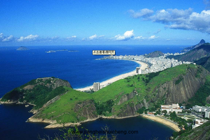 遠處,一條長龍飛架海灣兩岸,那是著名的尼泰羅伊大橋。這座大橋全長十四公里,把里約與對岸的尼泰羅伊市連結在一起;這一邊是浩如煙海的大西洋,波光粼粼的海面上不時地駛過巨大的海輪,三三兩兩形狀各異的小島在海浪潮水的拍擊下,時隱時現。遠處,科帕卡巴納海灘像一彎新月,橫臥在大西洋身旁,五顏六色、南來北往的小汽車宛若無數的甲殼蟲在月牙般的海濱大道上緩緩爬行……