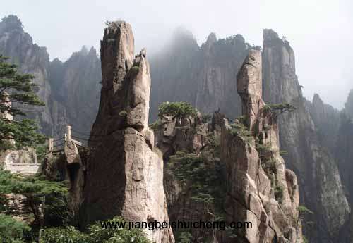 仙人踩高蹺在排云亭前,遠(yuǎn)瞰正前方,可見有一石,下端極細(xì),似一根根子插在地上,上端若一人直立,身子向前微傾,其狀酷似民間游樂(lè)節(jié)目“踩高蹺”。每當(dāng)云霧繚繞時(shí),則象仙人踩著高蹺,在西海峰壑中攬勝,故名“仙人踩高蹺”。