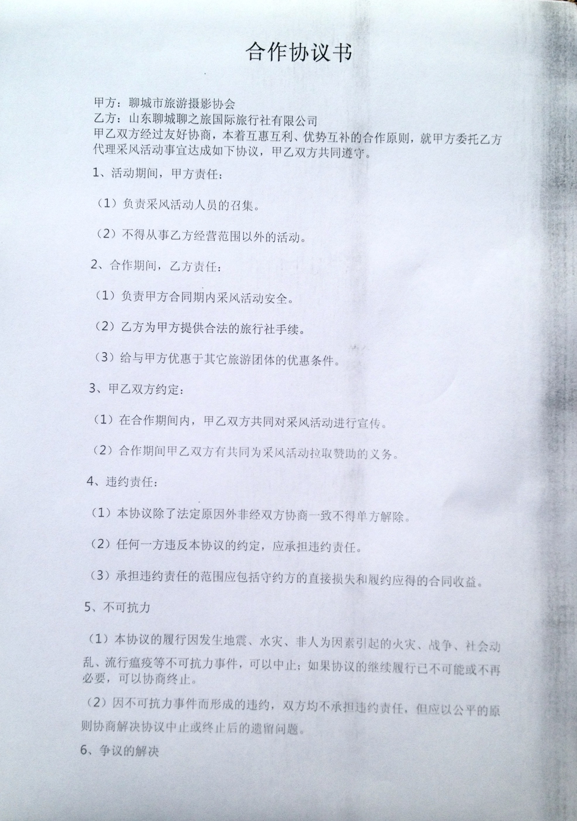 為響應(yīng)國(guó)家政策號(hào)召,聊城市旅游攝影協(xié)會(huì)委托我公司代理采風(fēng)活動(dòng)事宜,雙方經(jīng)過(guò)友好協(xié)商,本著互惠互利、優(yōu)勢(shì)互補(bǔ)的合作原則,達(dá)成以下協(xié)議。