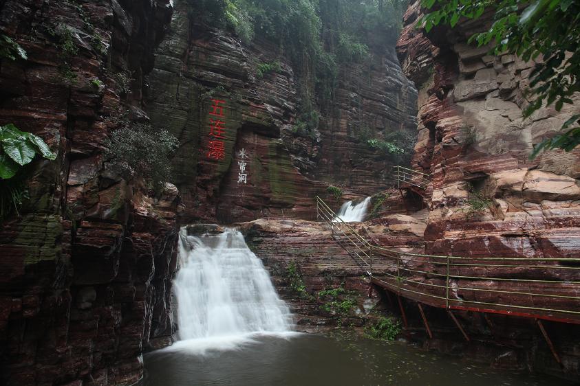 五連瀑水從西南峽谷中流出,形成五級連環瀑布。五連瀑的瀑布下有洞,人稱遇仙洞。傳說東漢永平年間劉晨和阮肇就是從這里被仙女接引到洞中的。