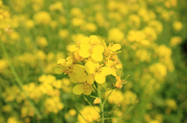 滿地的油菜花千姿百態、花團錦簇,有的星星點點,還是花骨朵,好像有點害羞,又好像不給人看它的真面目。還有的露出了金黃色的臉龐。靠近聞一聞還有淡淡清香,沁人心脾,仔細瞧!上面還有幾只蜜蜂,在辛勤勞動呢!花兒真多。每株油菜上有不少枝,枝上生杈,杈上又生杈,每枝杈上開滿了花。俯下身子看,菜花不計其數。突然,一只花蝴蝶飛來,一下飛,一下落,興奮地玩耍著。春風吹拂,菜花搖弋,仿佛滿金流動。田園風光使人愜意。