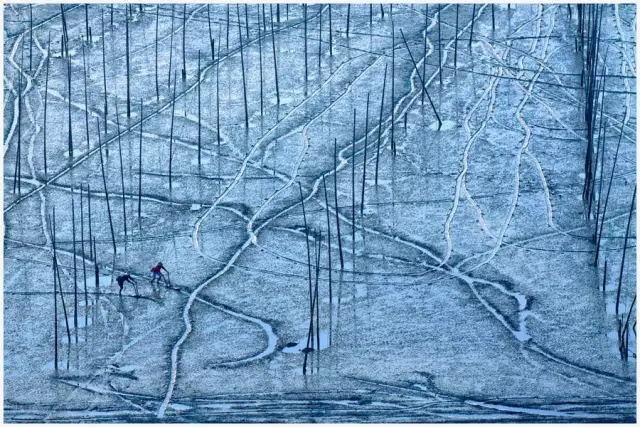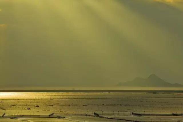 霞浦灘涂上以大面積的灰色為主,上面用于養(yǎng)殖的竹竿反光極為強(qiáng)烈,為了突出光影的效果,這些反光只能駕馭無法消除??梢钥紤]拍攝減少曝光量來進(jìn)行控制畫面的主體明度,達(dá)到增強(qiáng)光影效果的目的。選擇日落日出時(shí)段拍攝,化不利為有利。此時(shí)竹竿上的光比小,色溫暖,竹竿被夕陽染成了金色,為灘涂風(fēng)光造景造勢(shì)。曝光控制值要講究,如果對(duì)高光部位正確曝光,舍去暗部的細(xì)節(jié),得考慮到灘涂的竹竿在遠(yuǎn)處成像后非常細(xì)小,即使使用相機(jī)的點(diǎn)測(cè)光也無法測(cè)出高光部分的亮度,那 么只能使用評(píng)價(jià)測(cè)光來測(cè)量。曝光補(bǔ)償上減少2檔曝光。