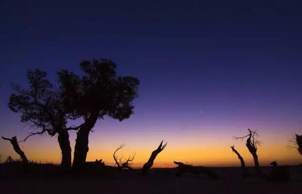 這里是一大片死去的胡楊林。胡楊千姿百態的造型在這里體現得淋漓盡致,有的直刺藍天,有的彎曲盤旋,還有的轟然倒下,散落了滿地的樹干,裸露的枯根在空中扭曲著,是最能出佳作的地方,拍攝黃昏日落美景。