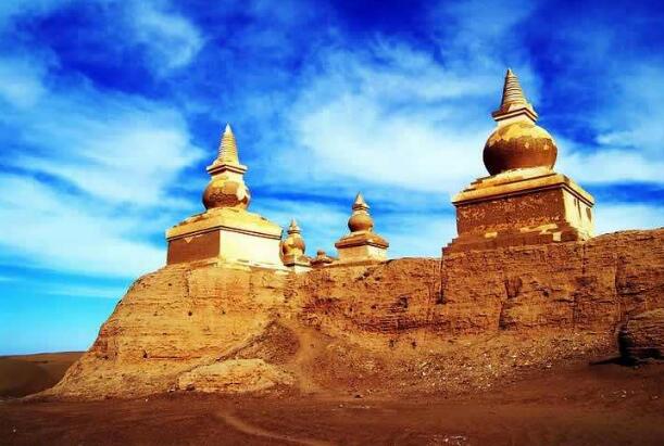 【黑水城】(最佳觀賞時間為下午夕陽西下之際)觀賞日月同輝的奇特景色。途中車覽紅城古堡、大同城遺址,感受蔚藍碧空之下金色戈壁,悠悠黑水城的孤獨、寂寞以及不甘的傾訴。黑水城為國家級文物保護單位,親們切記不可以攀爬城墻哦!
