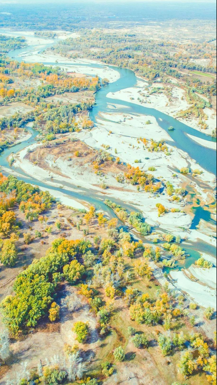 額爾齊斯河就是這么一條走不同尋常之路的河流。一路呼嘯奔騰,奔著北冰洋而去的它,也滋養了兩岸的土地。這里實在太適合航拍了,隨手一按就是一張媲美明信片的風景大片。