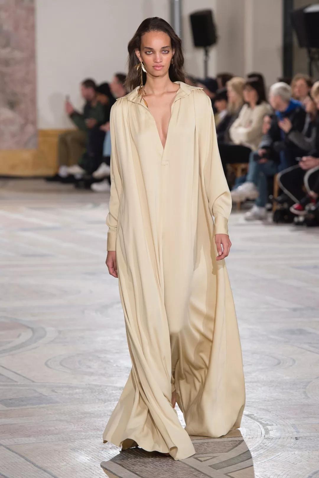 還是回到伸展臺(tái)上,頗具冷淡高級(jí)的品牌以簡(jiǎn)潔高級(jí)的真絲印花巾與經(jīng)典款羊毛針織衫做拼接,將度假風(fēng)情融于基礎(chǔ)款式和高級(jí)材質(zhì)中;而那些垂墜感十足的真絲襯衫,和挺括又輕軟的亞麻半裙,則營(yíng)造出強(qiáng)勢(shì)中不乏輕松的造型彰顯effortless時(shí)髦。