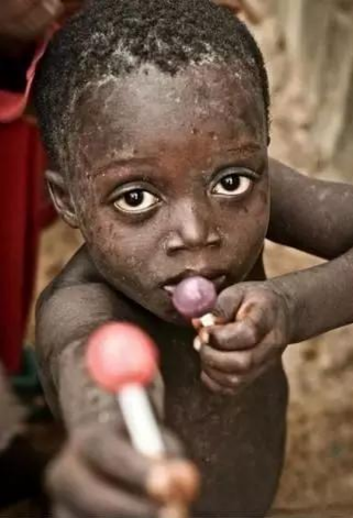 這是非洲難民區的一個孩子,常年忍饑挨餓,他有幸得到兩個棒棒糖,卻依然堅持送攝像叔叔一個棒棒糖。