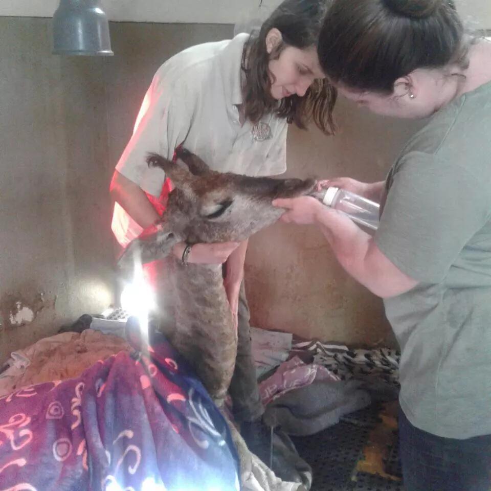 平常命硬學不來彎腰的長頸鹿,落難后被救到園區,也只能乖乖地低頭喝葡萄糖水。