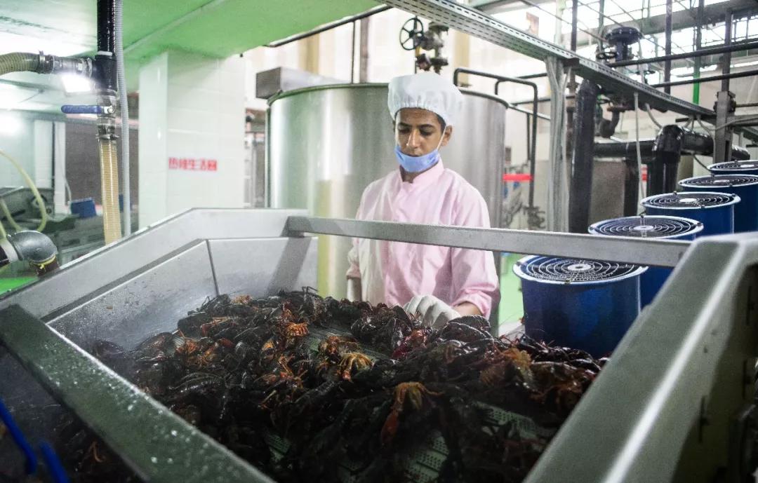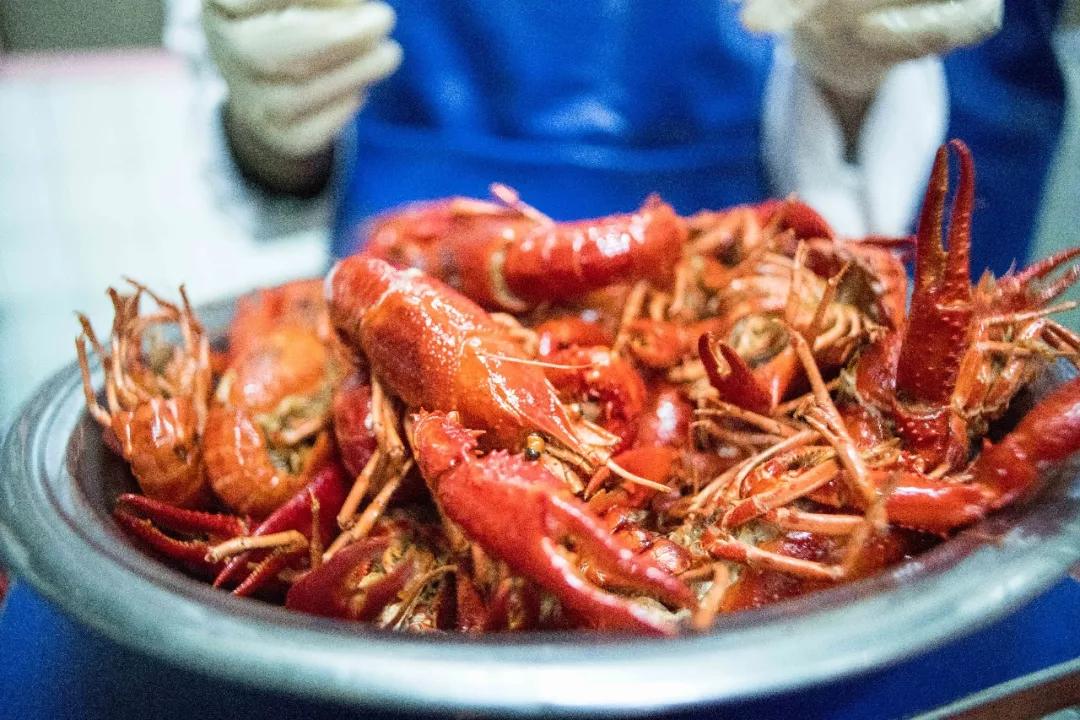 穿過分揀區(qū)域,3條集清洗、油炸、烘干、包裝于一體的大型生產(chǎn)線映入眼簾。生產(chǎn)線上,數(shù)以萬計的野生小龍蝦經(jīng)高溫烹制后呈現(xiàn)出十分統(tǒng)一的橙紅色。