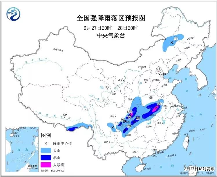 ·27日20時至28日20時,四川東部和南部、重慶、貴州北部、云南東北部、陜西東南部、河南南部、安徽西北部、湖北中西部、湖南西北部等地的部分地區有大到暴雨,其中,重慶北部、四川東北部、河南南部、湖北東北部等局地有大暴雨,最大小時降水量30~60毫米,局地可達70毫米以上,并伴有雷暴大風等強對流天氣。