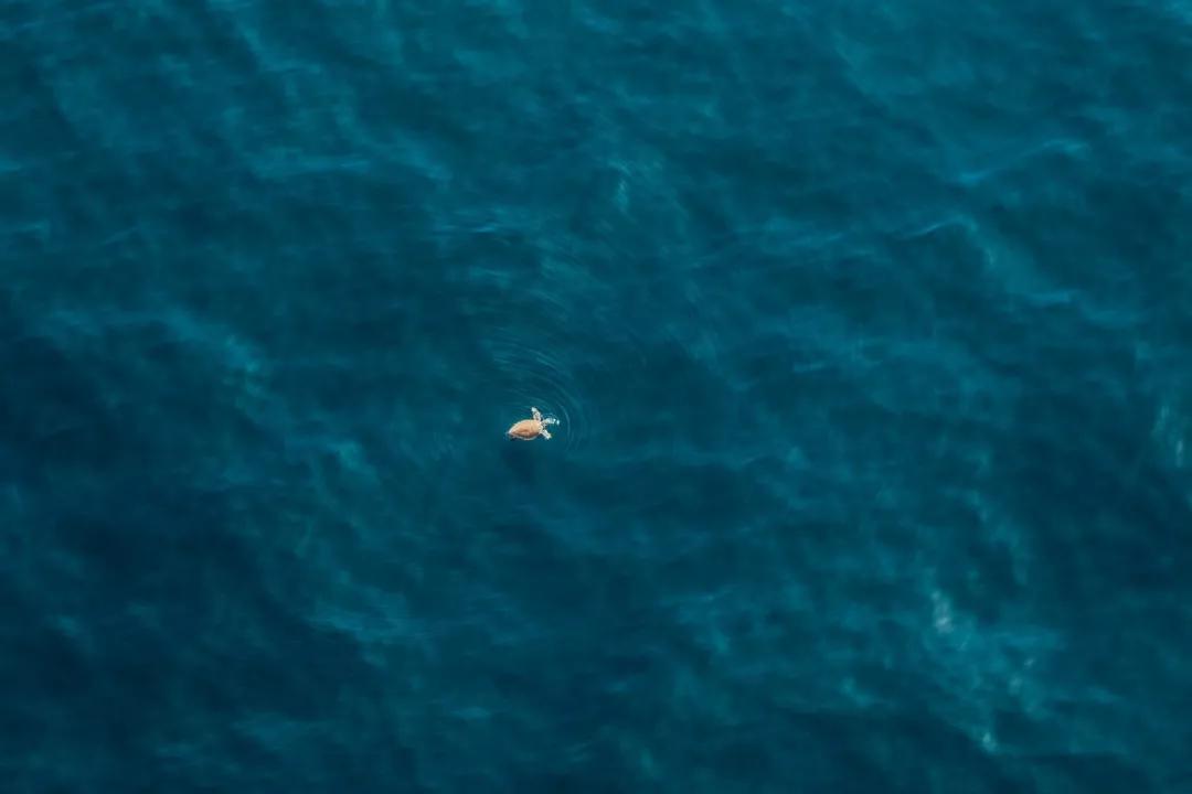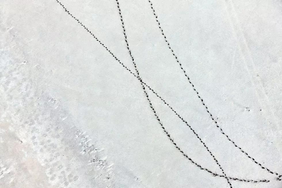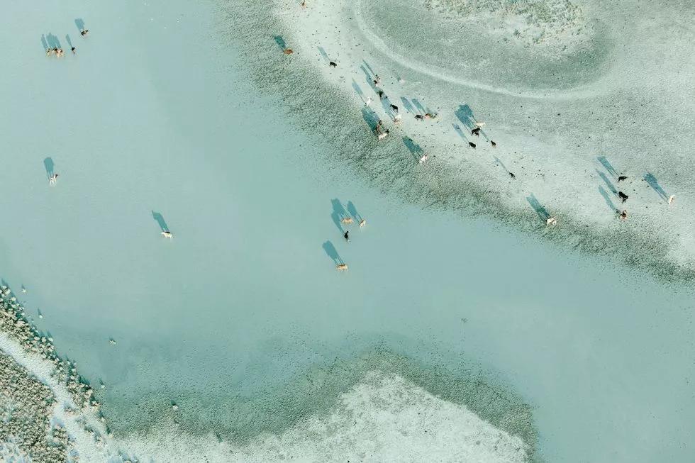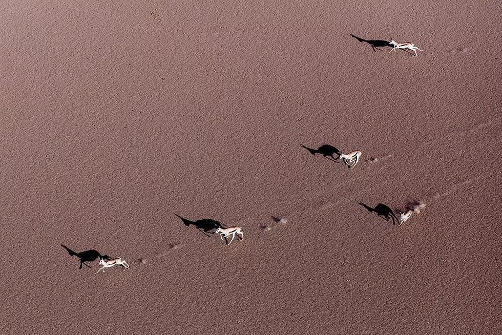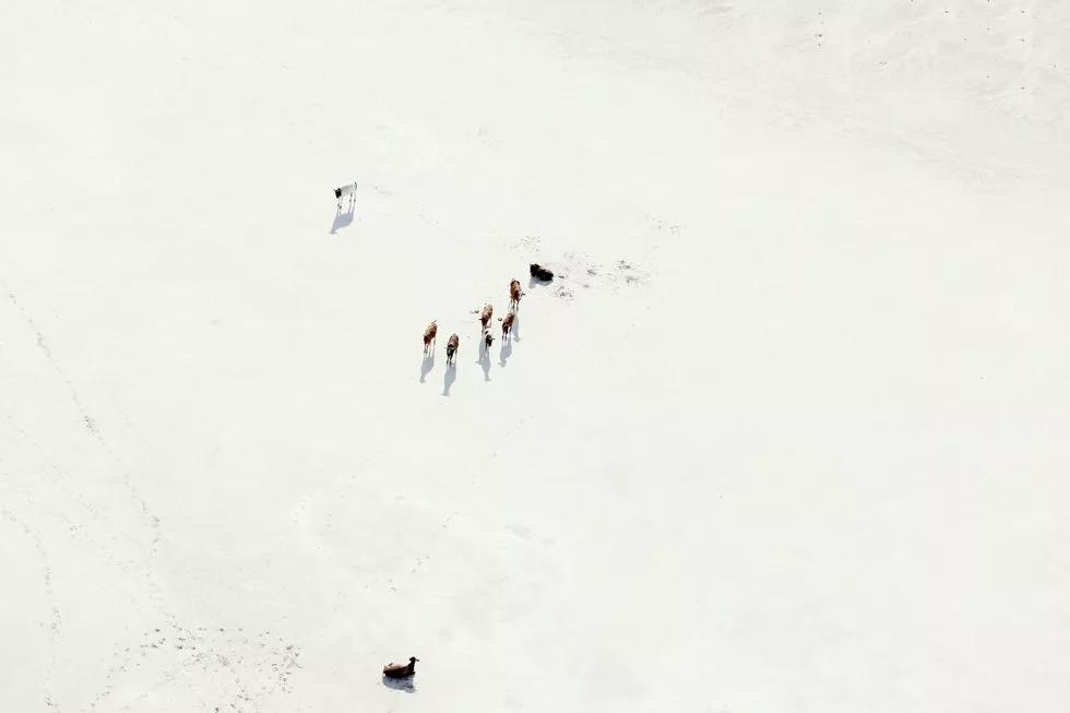 如火烈鳥、好望角大羚羊、甚至是一只在蔚藍的海水中休息的烏龜。動物們行進時留下的痕跡和陰影都是他作品中重要的組成元素。