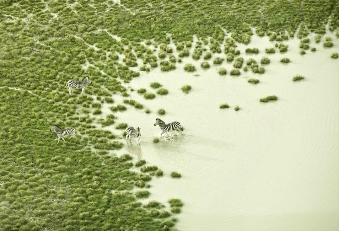 而鹽沼周圍,草木生長,海藻般的青綠色覆蓋了大部分的鹽池區(qū)域。成千上萬只粉紅色火烈鳥與斑馬群、公牛群和鬣狗在這里共同生活著。