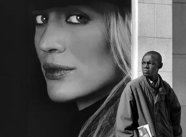 突出被攝主題的一個(gè)有效方法是讓它的尺寸看起來不太一樣,上面這張照片巨幅廣告里的女主角比實(shí)際生活中的男主角要大的多,對(duì)比起來,那個(gè)在角落里的黑人男性是那么卑微。