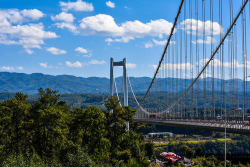 【龍江特大橋】亞洲最長的高速公路懸索橋——云南保山高速公路龍江特大橋,跨越龍陵縣龍江鄉上邦煥村與騰沖縣五合鄉大丙弄村之間的龍川江河谷,大橋全長2470.58米,保山岸索塔高度為169.688米,騰沖岸索塔高度為129.703米,橋面離江面280米,主跨長為1196米,成為目前亞洲最大的懸索橋;