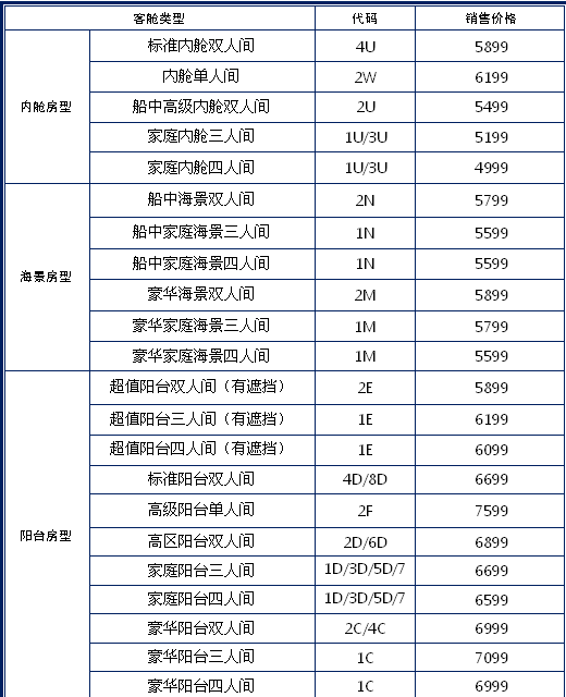 1、艙位價(jià)格詳情:
