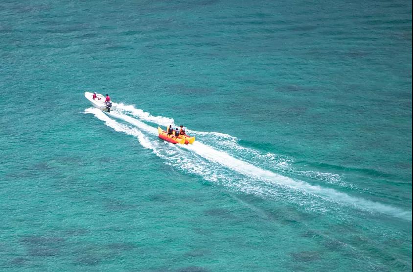 站在沙灘上,浩渺而又純凈的藍(lán)不斷涌來,依深淺的不同呈現(xiàn)出黃、綠、淺藍(lán)、深藍(lán)幾種顏色,仿佛畫上的風(fēng)景,島上可參加潛水等海上娛樂項目(海上娛樂項目費(fèi)用不含)或游泳拍照;