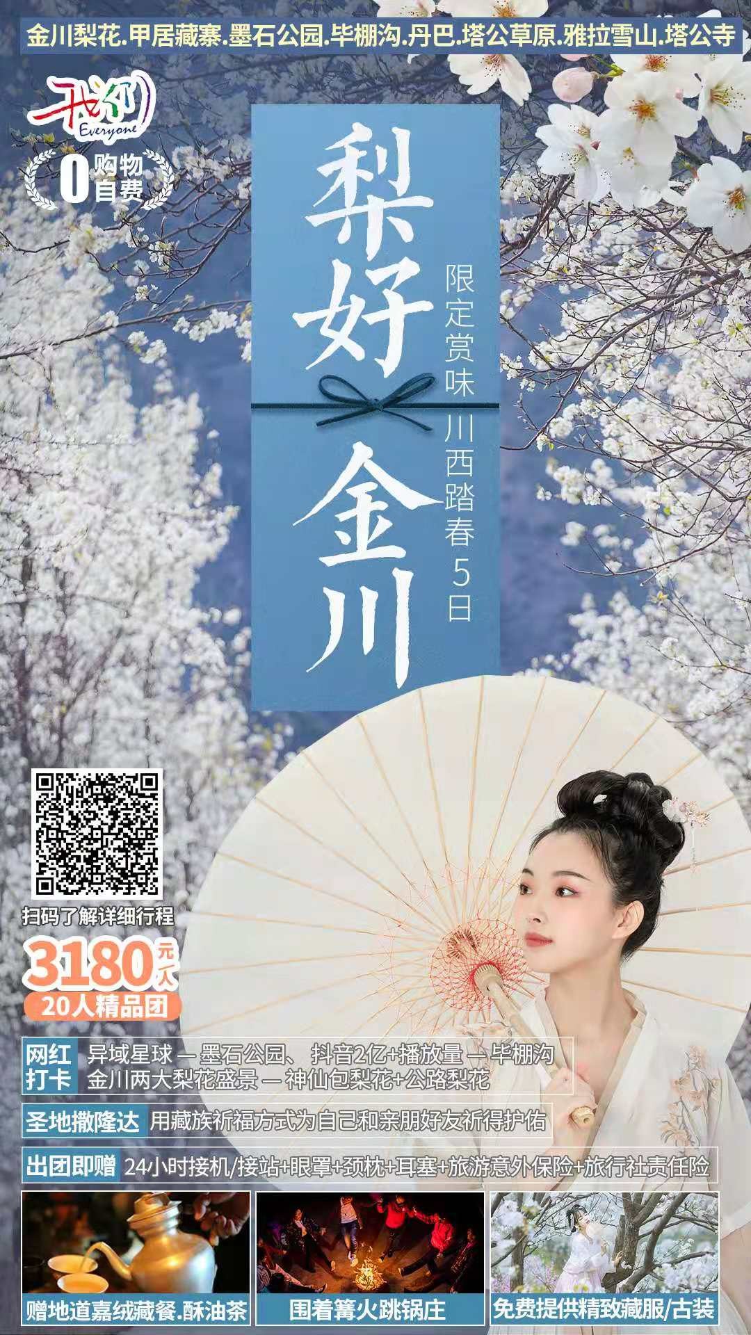 我們的團期是金川最好的時節,萬物復蘇的初春三月,正值金川成千上萬棵梨樹花期,雪白色的梨花競相開放,一片片、一層層的鋪散開來,漫山遍野的白色花海中夾雜零星新綠,空氣中氤氳著梨花清香,眼是天堂,身亦是天堂。