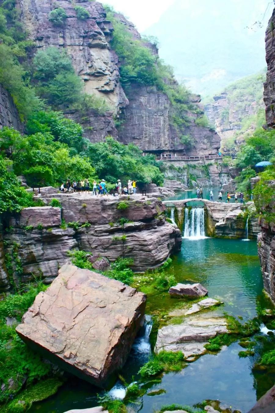 后前往云臺山,自行游覽盆景峽谷——【溫盤峪】(又名紅石峽)。那里集華夏山水與方寸之中;欣賞白龍瀑、黑龍洞、懸石、相吻石、含羞石、天女散化瀑等景觀,觀北方罕見景觀鐘乳石,盡情領略“真山、真水、真空氣”,游覽子房湖, 后游覽云臺山最高峰【茱萸峰】,茱萸峰是歷代文人墨客,僧道修行的圣地,這里植被茂密,古樹參天,有千年名樹紅豆杉,五角楓樹,太行花,森林覆蓋率高達93%,滿山覆蓋的都是原始次生林,有天然氧吧之美譽。踏千階的云梯棧道登上海拔1308米的茱萸峰頂,但見群山連綿,峰涌云動,使人頓生“會當凌絕頂,一覽眾山小”的豪邁氣概。俯視腳下,群峰形似海浪涌。山頂氣候多變,倏忽間風起云生,白霧從山間咕嘟嘟地涌出,紅日隨即隱去。山峰在云霧中出沒,云騰山浮,如臨仙界。玻璃棧道位于云臺山茱萸峰鳳凰嶺景點,在海拔1080米的半山腰上依崖而建。【玻璃棧道】分為兩段,其中一段沿崖壁呈U型,另一段懸于千米懸崖之上,總長400余米,寬約1.6米。(玻璃棧道體驗費,為20元/人需自理,如遇景區政策性關閉,則取消該景點,不另行通知,不退任何費用)