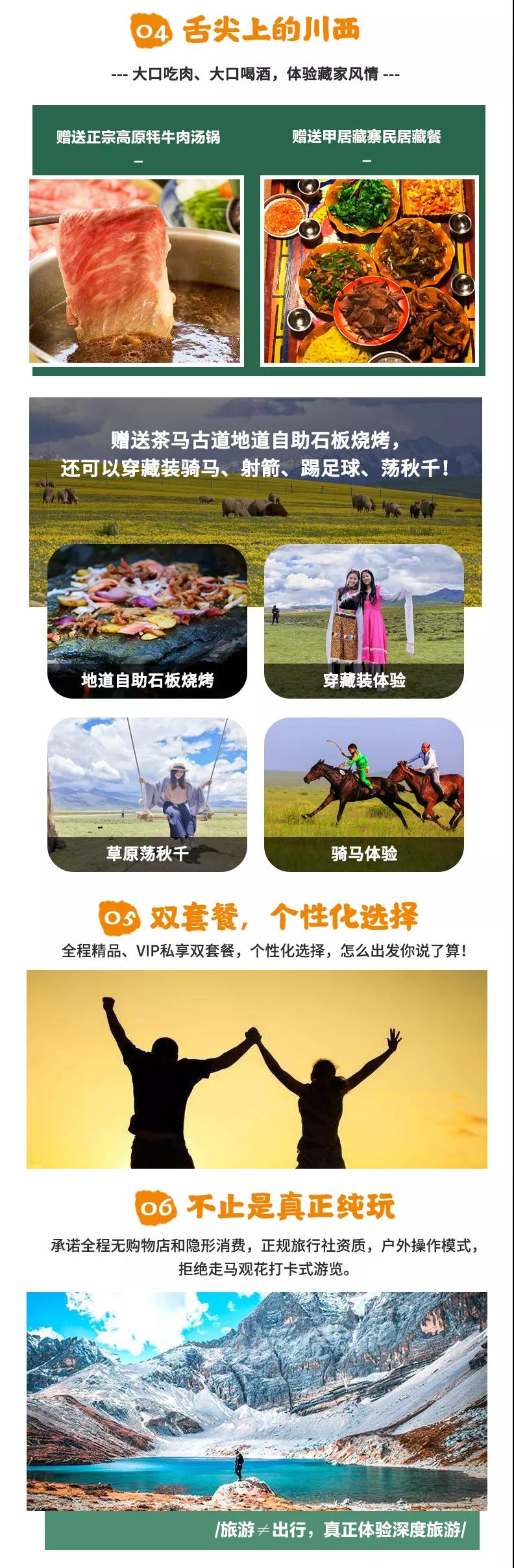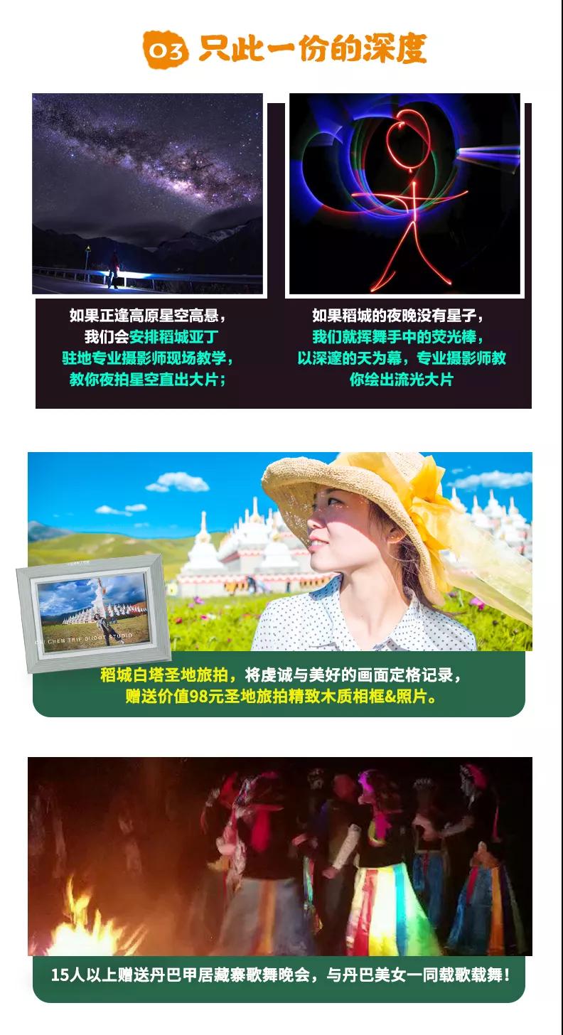 贈送:特色贈送甲居藏寨藏家晚餐、高原特色牦牛湯鍋、理塘茶馬古道自助石板燒烤;贈送旅游三寶、魔術頭巾、礦泉水緩解旅途疲勞;贈送價值98元圣地旅拍精致木質相框&照片;贈送稻城專業攝影師現場教學夜拍星空直出大片,沒有星星時則教拍流光大片;15人以上贈送甲居藏寨篝火晚會;贈送成都市區24小時接機/接火車服務;贈送項目不用不退。