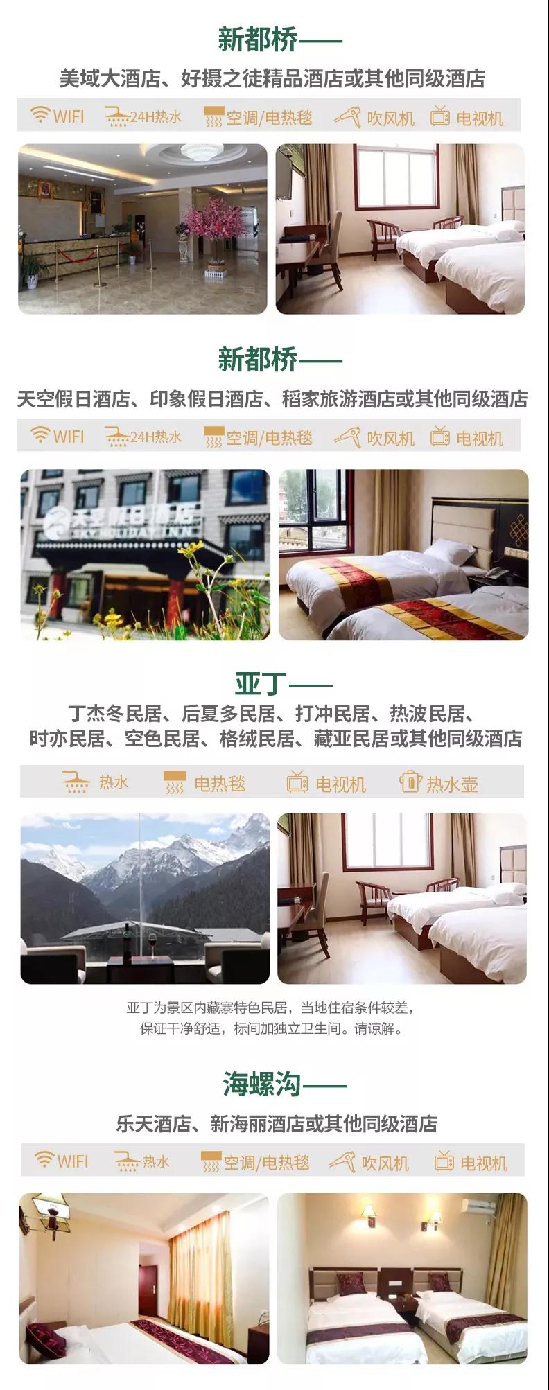住宿:6晚當地精品酒店雙人標間+免費升級一晚成都集合掛五酒店雙人標間,確保酒店干凈衛生,溫馨舒適。因沿途高原藏區條件有限,如果酒店設施沒有達到您的期望,敬請諒解。參考酒店如下:
