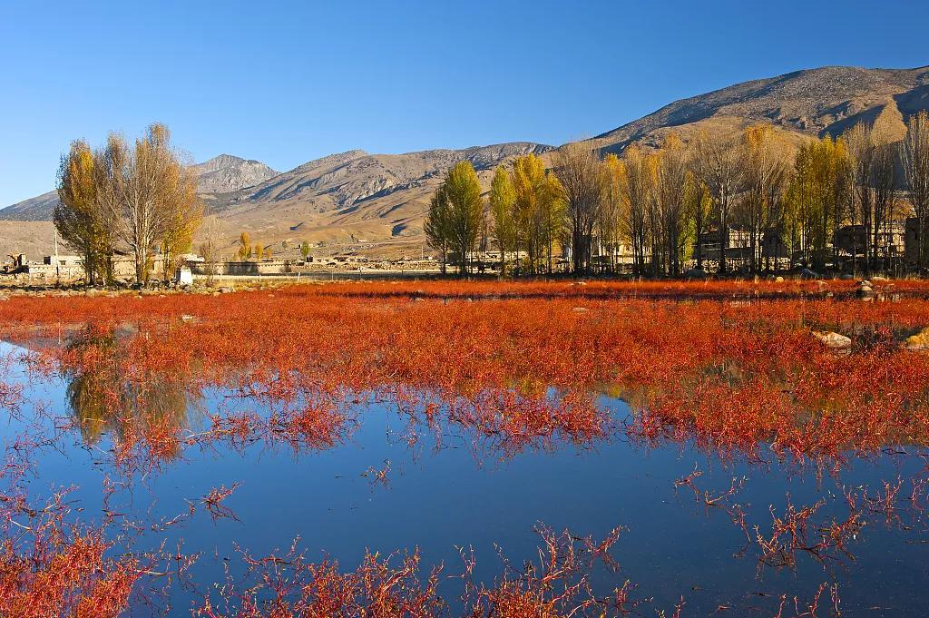 如果剛好遇到紅草季,我們將前往【桑堆紅草地】,欣賞那一抹浪漫的“高原紅”。生長在水中的紅草,大都疏密相間,像灌木枝扎根在水池中。這些紅草在陽光的照射下,紫里透紅,非常吸引眼球。遠處山腰斜坡上碩大的藏文六字真言,發散著一種雪域高原的神秘與莊嚴。