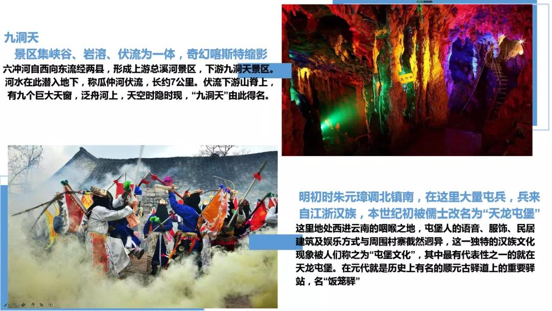 組成集伏流、峽谷、溶洞、天橋、天坑、石林、瀑布、冒泉及鐘乳石、卷曲石、生物化石等為一體的雄奇瑰麗的溶巖大觀。因其天窗洞口共有九個,因此謂之"九洞天"。
