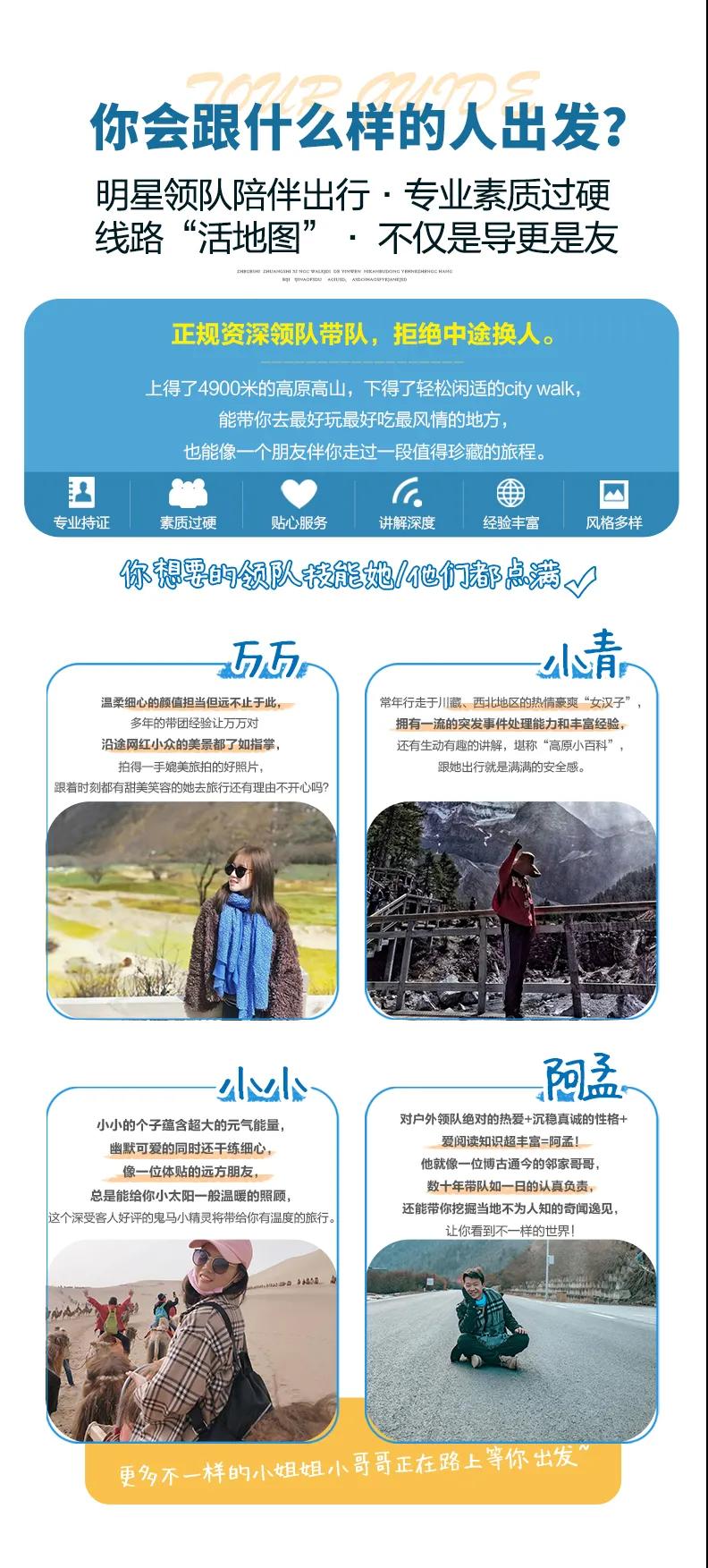 ? 私人訂制:我們客戶范圍囊括了全國各大城市,川西、西北、東北,皖南,貴州,在路上永遠有我們的身影。我們將為每一個有定制需求的你策劃出獨屬于自己的完美旅行。