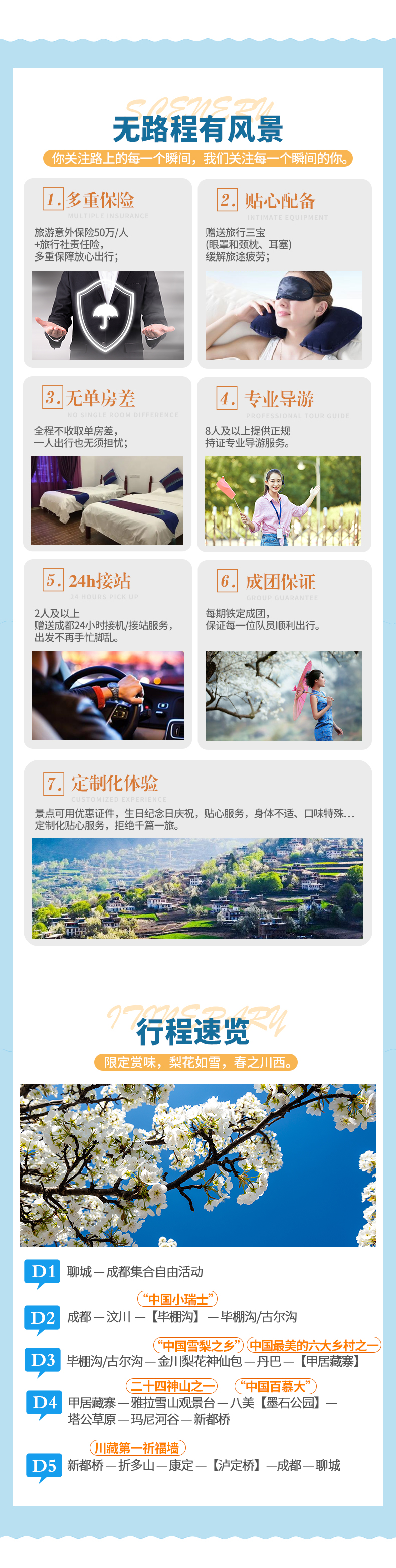 請對應使用「我們」金川梨花節6日行程,因使用其它行程造成的投訴,責任自負;請仔細閱讀以上行程文檔,同意并保證遵守我方安排,以免為您帶來不必要的麻煩;如產生合同糾紛或人身意外事故,按《中華人民共和國合同法》、《道路交通法》、《保險賠償條例》裁定;本行程作為旅游合同附頁與旅游合同同等法律效力。