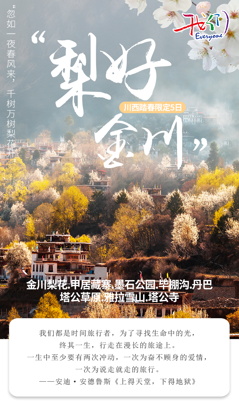 我們的團期是金川最好的時節,萬物復蘇的初春三月,正值金川成千上萬棵梨樹花期,雪白色的梨花競相開放,一片片、一層層的鋪散開來,漫山遍野的白色花海中夾雜零星新綠,空氣中氤氳著梨花清香,眼是天堂,身亦是天堂。