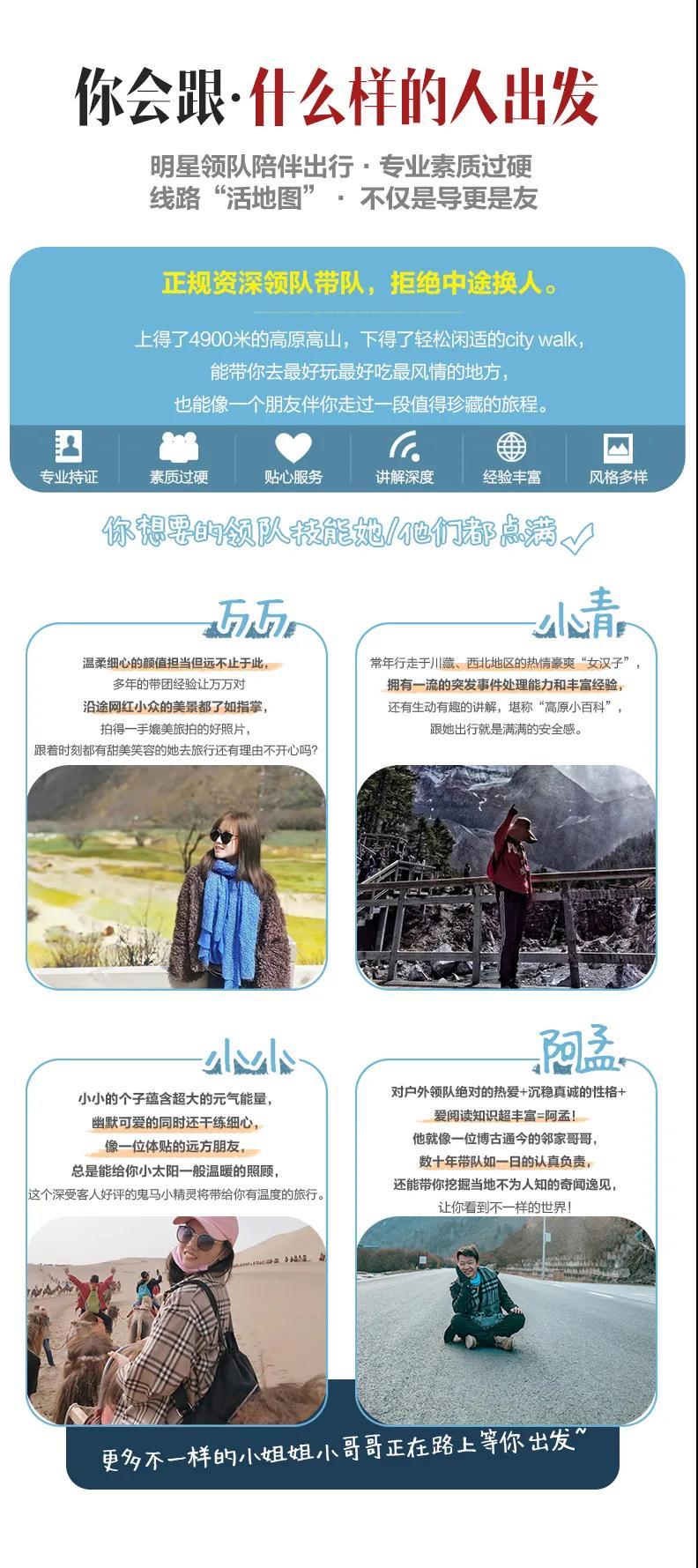 4、如途中遇不可抗因素(如高原反應、修路、塌方、車輛事故阻礙等)我方有權根據情況調整行程線路走向,此舉均是根據帶隊經驗為大家更順利的游玩而做出的改變,希望大家理解和支持,但如造成額外費用由客人自理,望您諒解;若對行程造成影響的,我方將全力協助游客進行解決,但不承擔由此造成的損失,若因此而增加的費用,敬請游客自理。