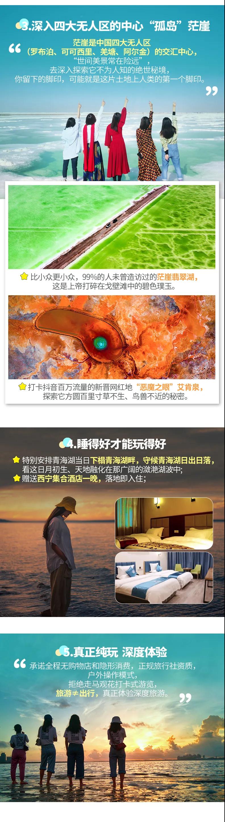 (5)茫崖翡翠湖、東/西臺吉乃爾湖、艾肯泉為小眾未開發景點,往年不設門票,若今年收費門票或環保費由游客自理。