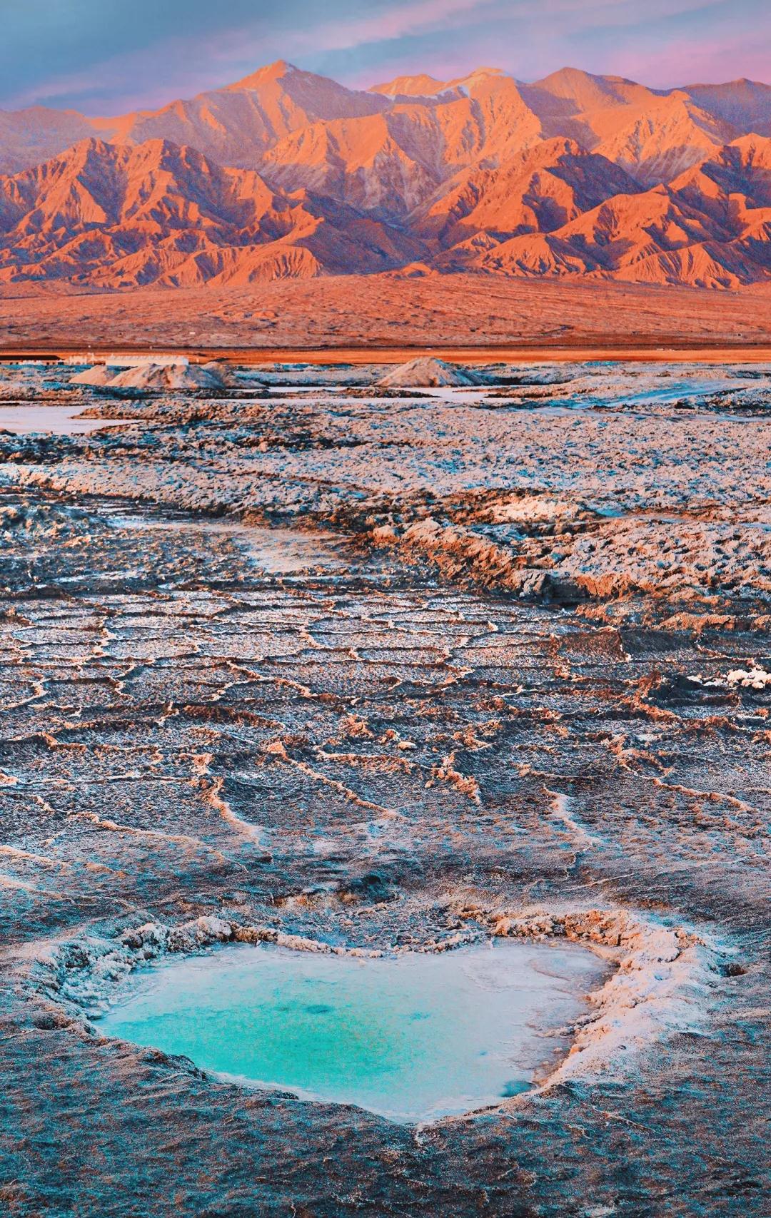 在水上雅丹不遠處便是【東臺吉乃爾湖】。乃爾湖岸邊盡是覆蓋著的白色結晶,湖周圍是大片的雅丹地貌,搭配上顏色干凈到極致的湖水、西北特有的廣闊無垠的天空,純粹而強烈的視覺沖擊,這方圓百里大漠戈壁無人區的珍寶明珠,這只屬于大自然的神秘顏色,讓你仿若來到了世界的盡頭,讓你感受一種歸于自然的內心平靜。