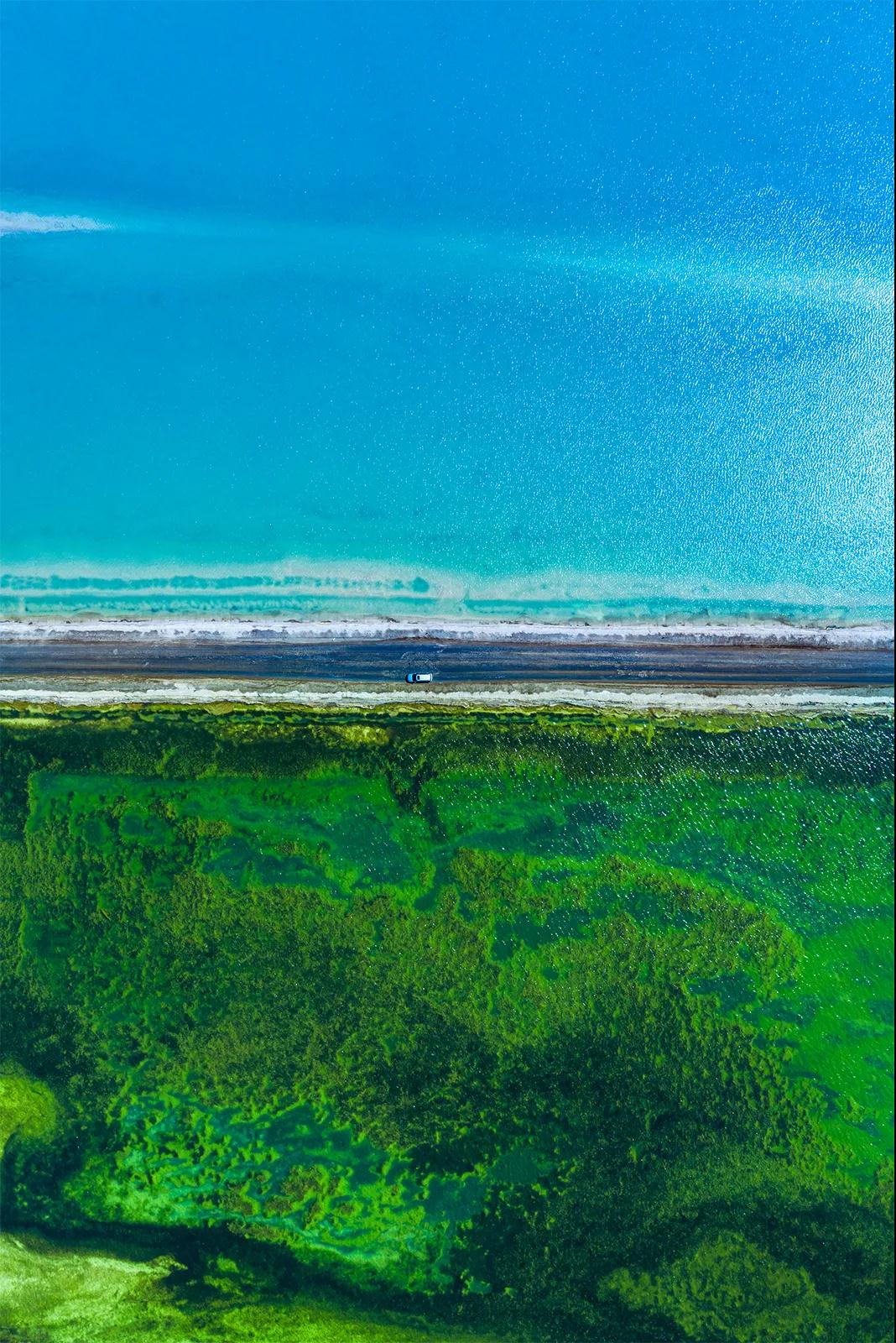 然后我們抵達第一站——位于柴達木深處最純凈的天空之境【茫崖翡翠湖】,這個鹽湖99%的游客未曾造訪,當大部分游人的目光還聚集在大柴旦翡翠湖的時候,我們已經身處在無人秘境之中。草綠色的湖水與潔白的鹽花默契相印,儼然一顆具有天然裂紋的綠寶石,“翡翠”這個詞便是對這不摻一絲雜質的碧綠湖水最貼切的形容;白云低垂,擁吻碧波 這里猶如加了濾鏡的玻利維亞烏尤尼鹽沼,給寂寞荒涼的茫崖增添了一抹柔情和嫵媚。這里是真正的天空之境,沒有游人如織,沒有翻飛的紅絲巾,沒有吵鬧,沒有喧囂,天地唯你一人。
