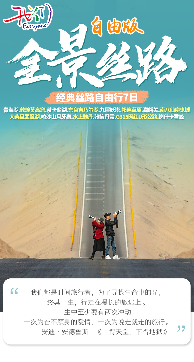 青海湖+敦煌莫高窟+茶卡鹽湖+東臺吉乃爾湖+九層妖塔+祁連草原+嘉峪關+南八仙魔鬼城+大柴旦翡翠湖+鳴沙山月牙泉+水上雅丹+張掖丹霞+G315U形公路+崗什卡雪峰