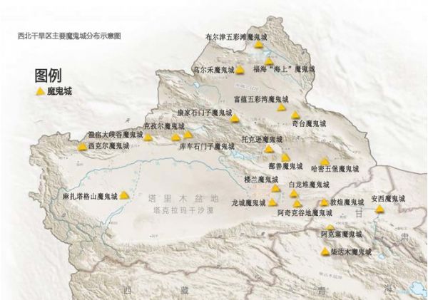 從地圖上我們可以明顯看到,北疆是魔鬼城的主要分布區(qū)域,甘肅、青海也有少量分布,實(shí)際上,在西北資料可查的雅丹地貌群就近百余處,它們一個(gè)個(gè)神秘地屹立在西北疆域上,成為了寂寞荒原上的一場(chǎng)視覺(jué)盛宴,數(shù)量之多,形態(tài)之多,就像是一個(gè)神秘而龐大的“魔鬼”家譜,實(shí)際上,它們并不是被人類遺棄或鬼神建造的“古城”,而是經(jīng)過(guò)風(fēng)蝕形成的一種特有地貌景觀,用我的話講就是被風(fēng)吹了多少年的一堆大土丘~可是深入其中,高高低低的“建筑群”投下錯(cuò)亂光影,在這里幾乎看不到任何生命的跡象,因?yàn)殍F含量過(guò)高,磁場(chǎng)不穩(wěn)定, 指南針進(jìn)入雅丹地貌經(jīng)常會(huì)不管用,尤其在夜深人靜,遇到風(fēng)吹,聲音似鬼哭狼嚎,極其陰森恐怖,故被稱為“魔鬼城”。如果晚上在魔鬼城里露宿一夜,想必也會(huì)是一種奇妙的體驗(yàn)~