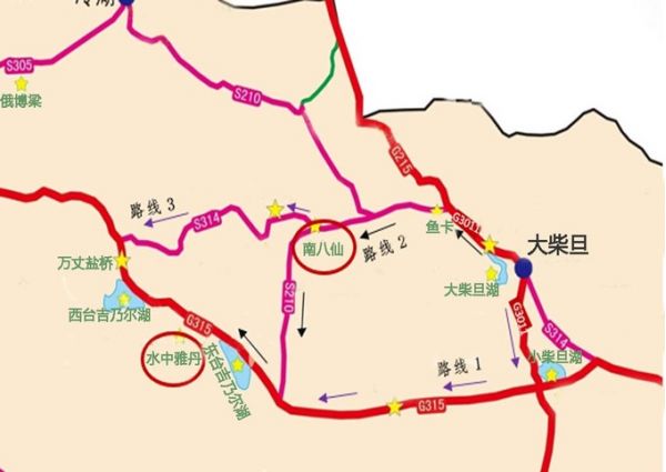 線路2:大柴旦南下高速G3011,沿“中國(guó)66號(hào)公路”之稱的315國(guó)道一直向西,沿途路過(guò)察爾汗鹽湖,這條路線路程短,車稍多,注意車速。