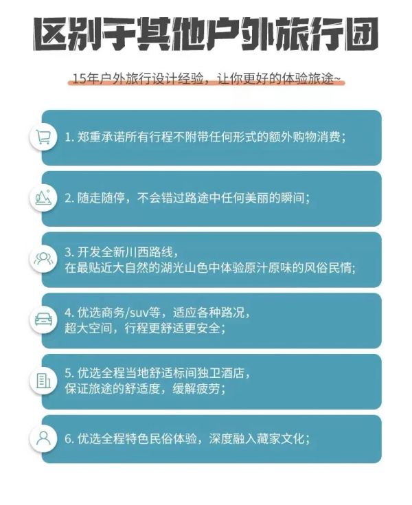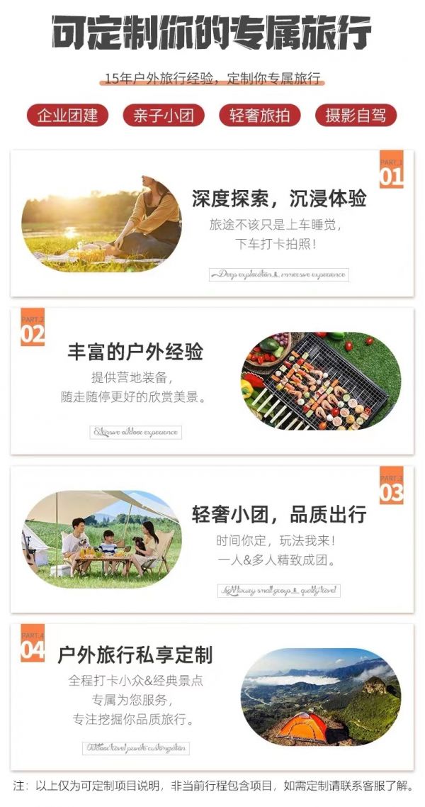 私人訂制:我們業務范圍囊括了全國各大城市,川西、西北、新疆、西藏,在路上永遠有我們的身影。我們將為每一個有定制需求的你策劃出獨屬于自己的完美旅行。