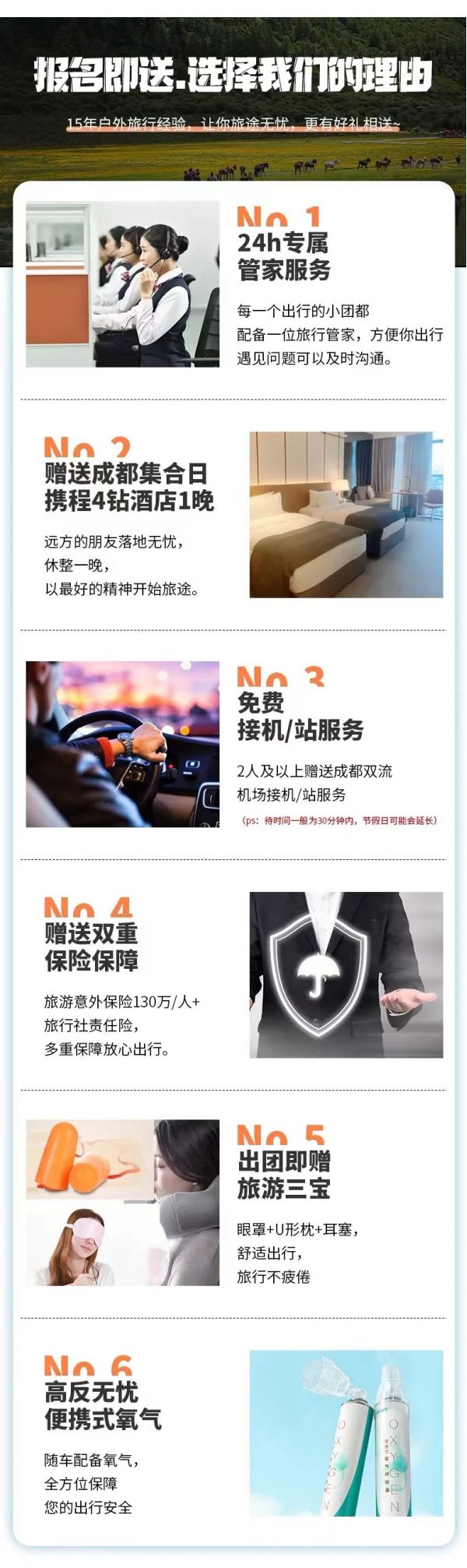 2、禁忌:川西地區受宗教影響,風俗習慣有所不同,游覽時(如進寺廟),請謹記當地領隊宣布的有關旅游注意事項,入鄉隨俗,在任何場合下都不要提及有關少數民族的政治問題。行程若存在景點需騎馬,為您的安全著想,騎馬必須由馬夫牽韁方能騎行,請勿獨自騎馬或騎馬奔跑,險路及下坡路必須下馬步行,否則造成的損傷,概由游客自行承擔