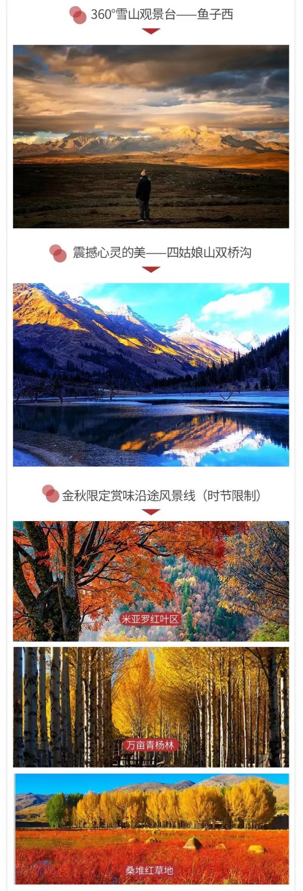 早餐后前往甲居三號觀景臺晨拍,之后告別晨曦中的丹巴甲居藏寨,前往四姑娘山雙橋溝景區游玩(門票80元/人,觀光車70元/人,必須乘坐,費用自理),景區開闊平坦、景點集中,全程通車。雖已開發,但環境維護的出于意料的好,景區內各種服務包括指示也十分清晰明了,隊員們可以更加舒適、方便的游覽整個景區。由于整條溝海拔落差達到一千多米,所以地貌比較豐富,風景也完全值得期待。給人遠離塵世的感悟。游玩盡興后出溝繼續啟程,而后翻越巴朗山,觀看植物從常綠闊葉林到高山荒漠的垂直變化,感受“一山觀四季、十里不同天”的氣象變遷。沿臥龍峽谷,欣賞峽谷小橋、流水、枯藤、老樹的美麗風光抵達映秀,感受2008年汶川大地震“地動山搖、山崩地裂、滄海桑田”后的景象,感悟大自然的力量;之后沿都汶高速返回成都統一散團(由車上游客協商一致送至統一散團點,若協商不成則由司機送至三環內就近地鐵站散團),結束本次愉快的旅行。由于川西地區路況復雜,山道狹窄,有可能因為堵車而發生延誤,請大家盡量預定第二天返程的航班或車次。