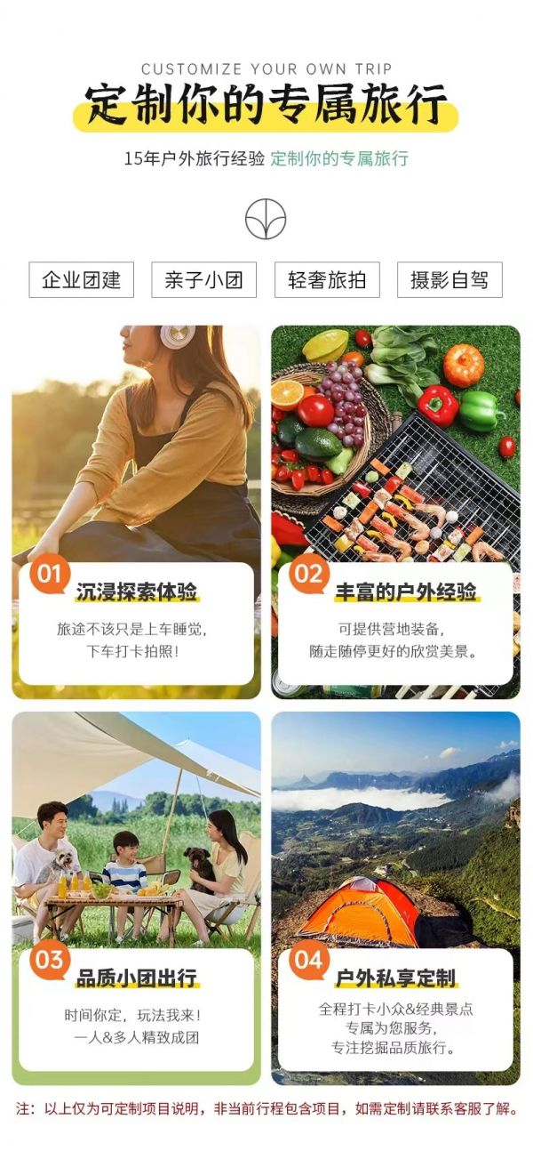 私人訂制:我們業(yè)務(wù)范圍囊括了全國各大城市,川西、西北、新疆,在路上永遠有我們的身影。我們將為每一個有定制需求的你策劃出獨屬于自己的完美旅行。