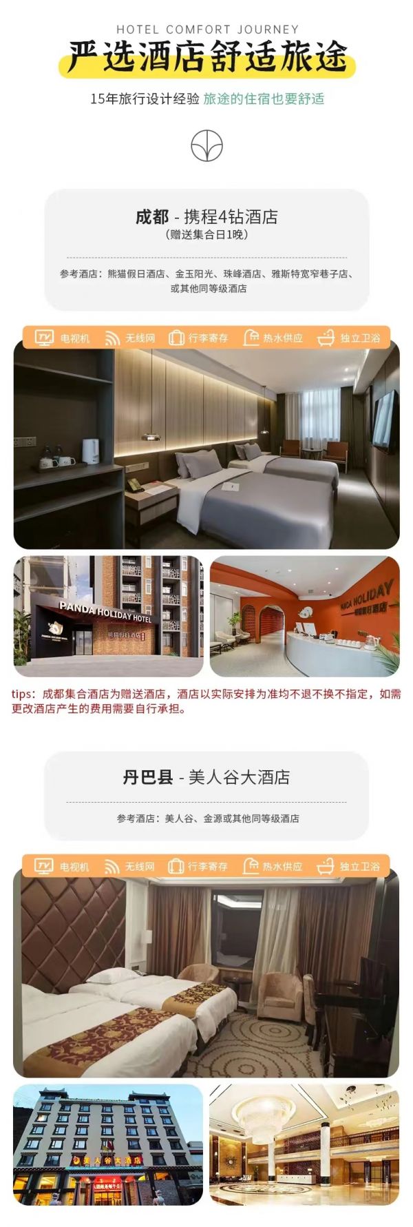 住宿:含全程6晚舒適酒店。(tips:成都集合酒店為贈送酒店,酒店以實際安排為準均不換不退不指定,如要更改酒店產(chǎn)生的費用需要自行承擔(dān)。)