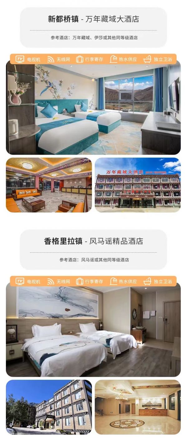 住宿:稻城或香格里拉鎮(zhèn)酒店標間說明”起個大早,晨暉中新都橋景色如畫:小橋、揚樹、水溪、人家、藏式民居,濃郁的高原風(fēng)情畫卷。經(jīng)雅江,翻過高爾寺山(4412米)、剪子灣山(4659米)、后翻越卡子拉山(4718米),在西俄洛觀景臺還可以欣賞到“會當(dāng)臨絕頂,一覽眾山小”的壯觀景象,抵達世界高城,高原明珠丁真的故鄉(xiāng)——理塘縣(海拔4000米)。游勒通古鎮(zhèn),觀千戶藏寨(位于理塘縣城北老城區(qū)),這里由13個藏寨4000余戶藏房集中而成的藏區(qū)最為集中,規(guī)模最為宏大的千戶藏寨群,有距今400余年歷史的七世達賴故居——仁康古屋。后繼續(xù)出發(fā),覽美麗的無量河風(fēng)光后翻越兔兒山風(fēng)景區(qū)、海子山自然保護區(qū)(H4500—5030米,是青藏高原最大的古冰體遺跡),經(jīng)桑堆(桑堆紅草地是季節(jié)性的景點,只有秋天才能看到,此處有當(dāng)?shù)厝耸召M,需自理),后經(jīng)稻城白塔,沿途欣賞萬畝楊樹林公園、赤土河谷迷人風(fēng)光、世外桃源般藏式村寨,抵達酒店辦理入住。