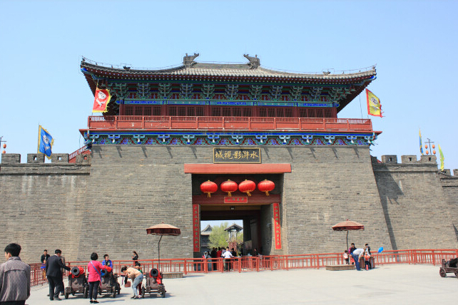 水滸影視城以《水滸傳》中描述的人物故事為背景,充分展現(xiàn)水滸故里歷史風(fēng)貌和民俗人情,主要建設(shè)了王爺府、太師府、太尉府、青樓、樊樓、甕城、御龍坊、東京汴梁御道、紫石街等仿宋代建筑,古風(fēng)濃郁,工藝精湛,細(xì)致逼真,進(jìn)入城中,猶如跨入歷史;漫步城中,宛若暢游千年。