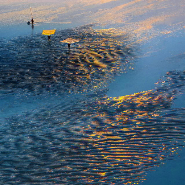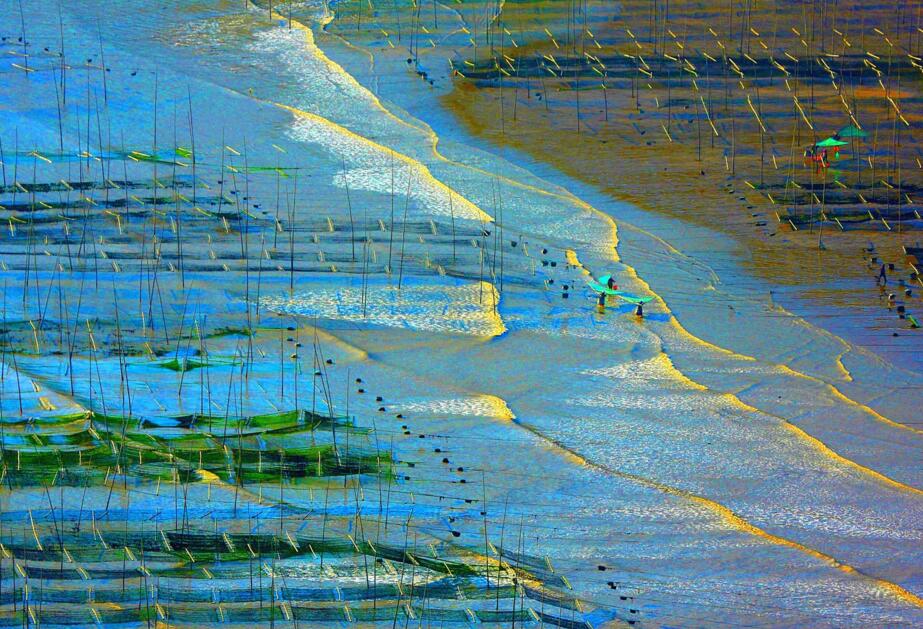 第一,有人有景,營造情景交融的場景。霞浦灘涂常年都有人在勞作,點綴在灘涂上的人遠處看去雖然是星星點點的,但是往往是畫龍點睛之筆。