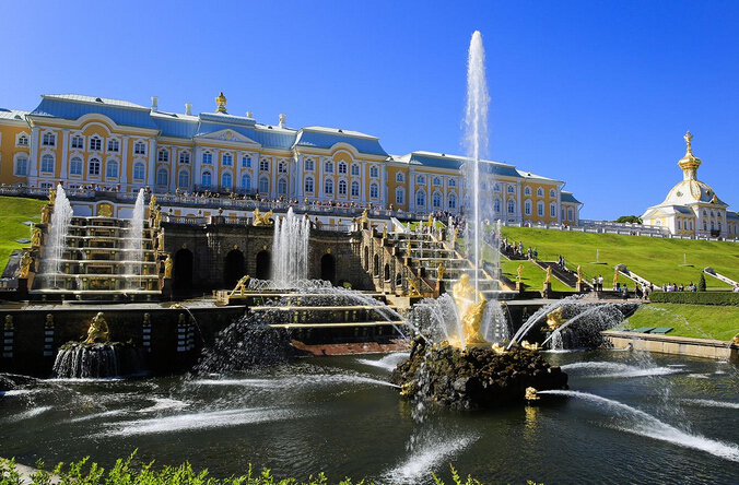 夏宮(入內,約2小時):又稱彼得宮,是彼得大帝的消暑行宮,它始建于1714年,分為上花園和下花園,大宮殿在上花園。這里的建筑豪華壯麗,被譽為“俄羅斯的凡爾賽”,大宮殿前是稱作大瀑布的噴泉群。這里有37座金色雕像,29座潛浮雕,150個小雕像,64個噴泉及兩座梯形瀑布。在噴泉群一個大半圓形水池的中央,聳立著大力士參孫和獅子搏斗的雕像,這就是著名的隆姆松噴泉。塑像高3米,重5噸。在夏宮花園中還有戰神廣場,其中央的一簇永恒之火,為記念1917年及之后內戰中犧牲的將士而點燃。